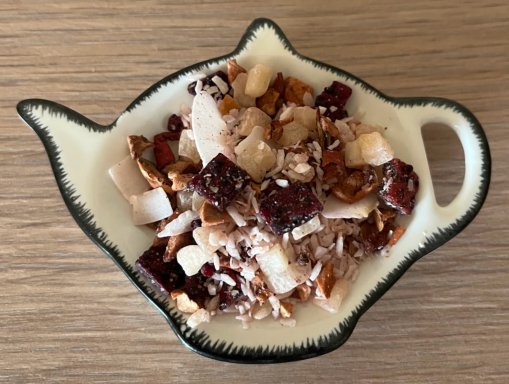 Ingrediënten: Ananasblokjes (suiker, citroenzuur), appelstukjes, paarse drakenfruitblokjes, kokosvlokken, natuurlijk aroma en gevriesdroogde granaatappelpitjes.